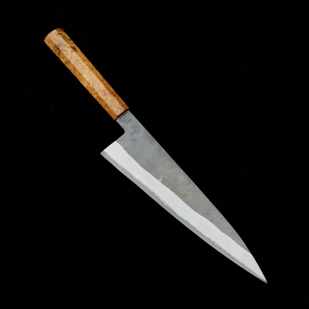 This blade has a differential heat treatment, the spine is coverd in clay before the treatment so the spine remains soft and the steel in the edge is hardened. After sanding the blade and etching it in acid, the “hamon” is revealed, the white line that separets the hard and the soft steel, a beautiful visible consequence of thit very ancient technique.